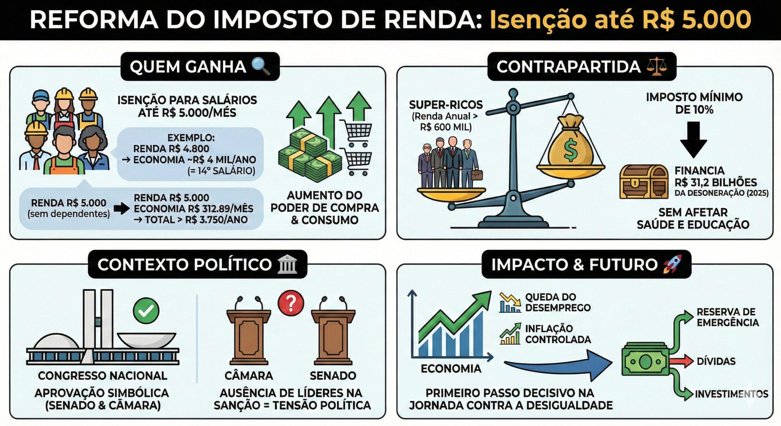 Em pronunciamento transmitido em cadeia nacional neste domingo, 30 de novembro, o presidente Luiz Inácio Lula da Silva anunciou uma mudança estrutural na política tributária brasileira. A isenção do Imposto de Renda para assalariados que recebem até R$ 5.000 mensais, sancionada na última semana, deve direcionar R$ 28 bilhões à economia brasileira. O chefe do Executivo classificou a medida como o fim de um “vergonhoso” privilégio histórico, estabelecendo um novo patamar de justiça fiscal após mais de um século de vigência do tributo.