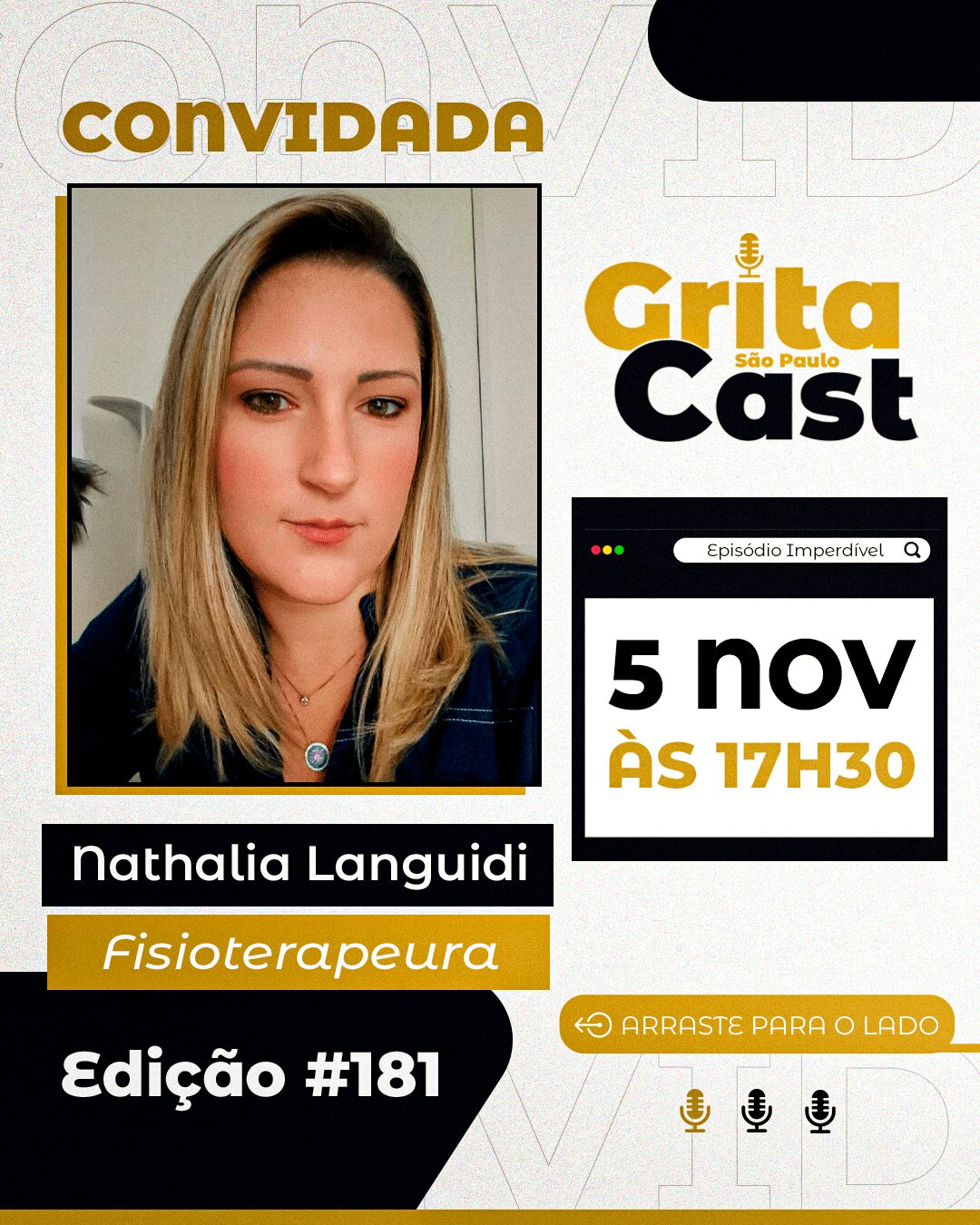 A próxima edição do GritaCast #181 – podcast oficial da Agência de Comunicação Grita São Paulo – recebe Nathalia Languidi, fisioterapeuta especialista em fisioterapia dermato funcional e pélvica. Vamos ter a oportunidade de conversar ao vivo na quarta, dia 5 de novembro, às 17h30 pelo canal do YouTube e Instagram. É uma oportunidade de ouro para os nossos espectadores tirarem dúvidas pelo chat das plataformas.